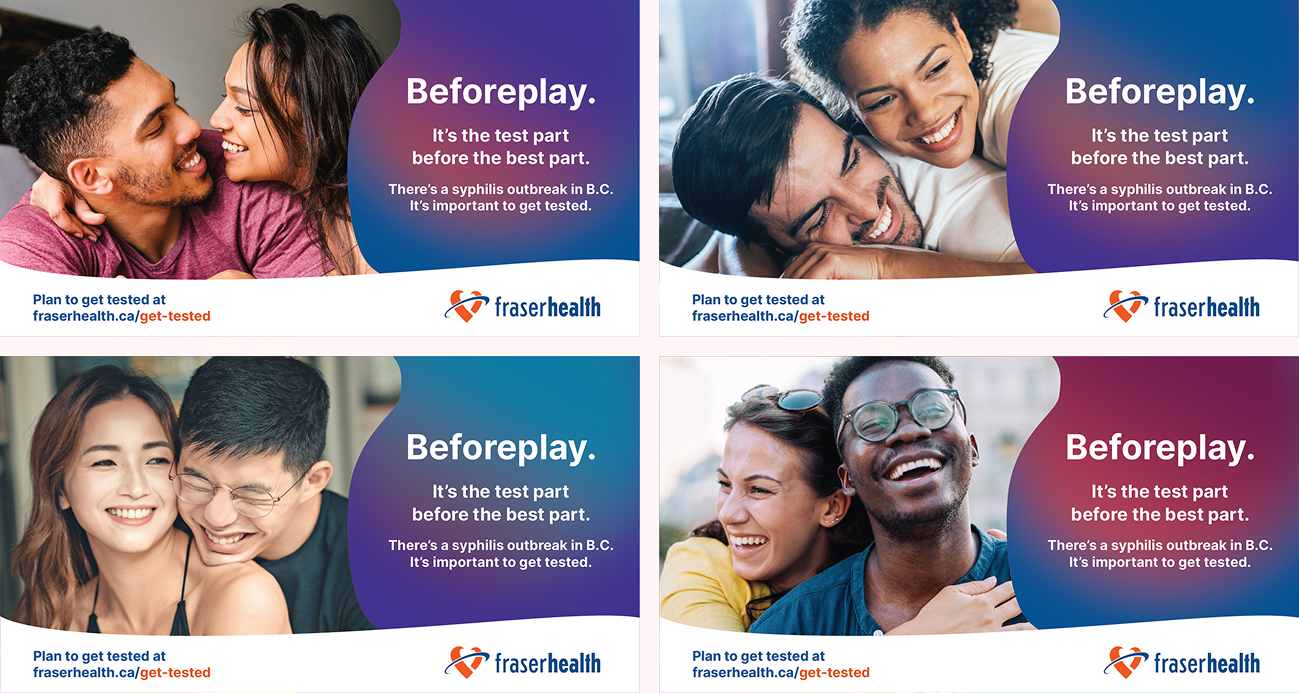 Launched by Fraser Health Authority, the Syphilis Campaign aimed to encourage women of child-bearing age (25-39 years old) to be aware of and test for syphilis. The message was made clear through digital Meta ads and printed transit ads such as bus, bus shelters, and skytrain station ads.